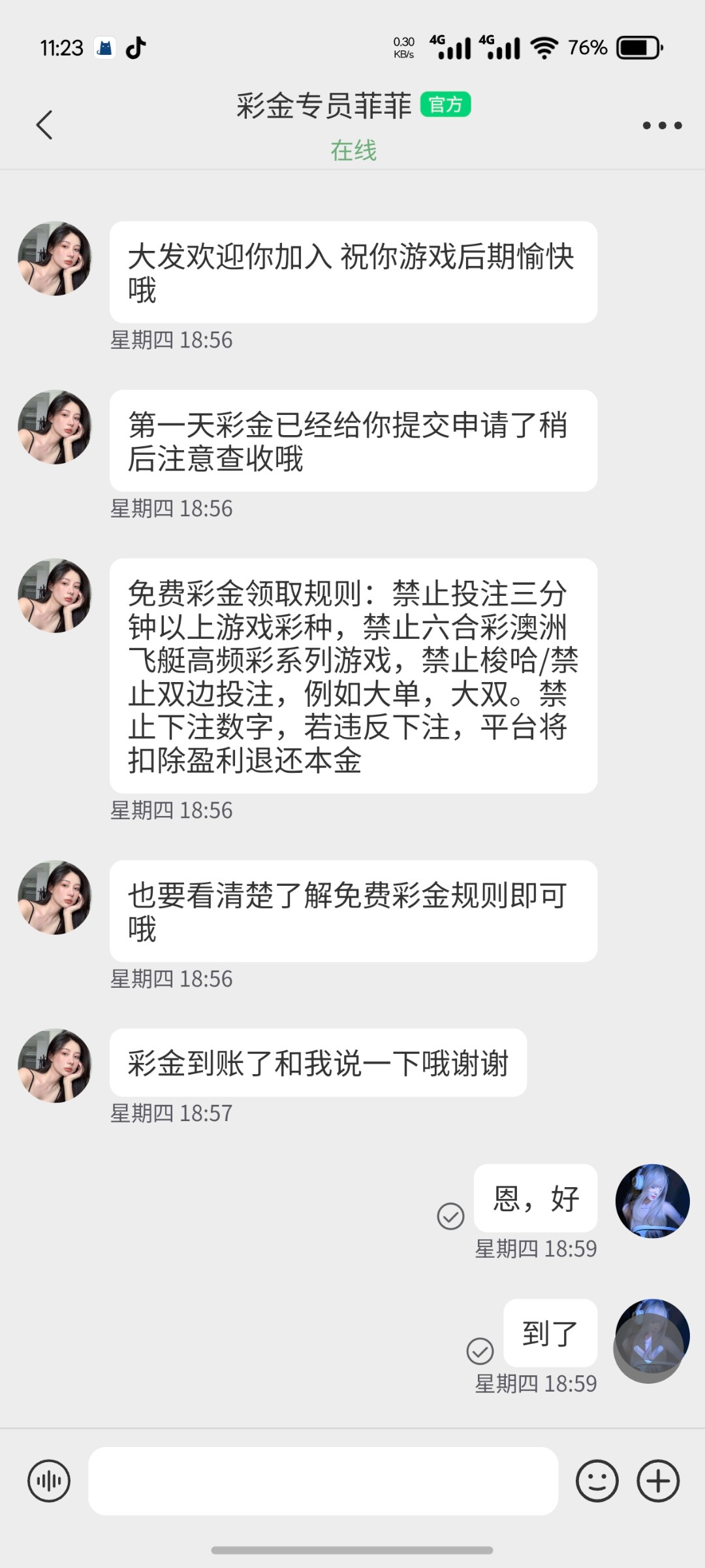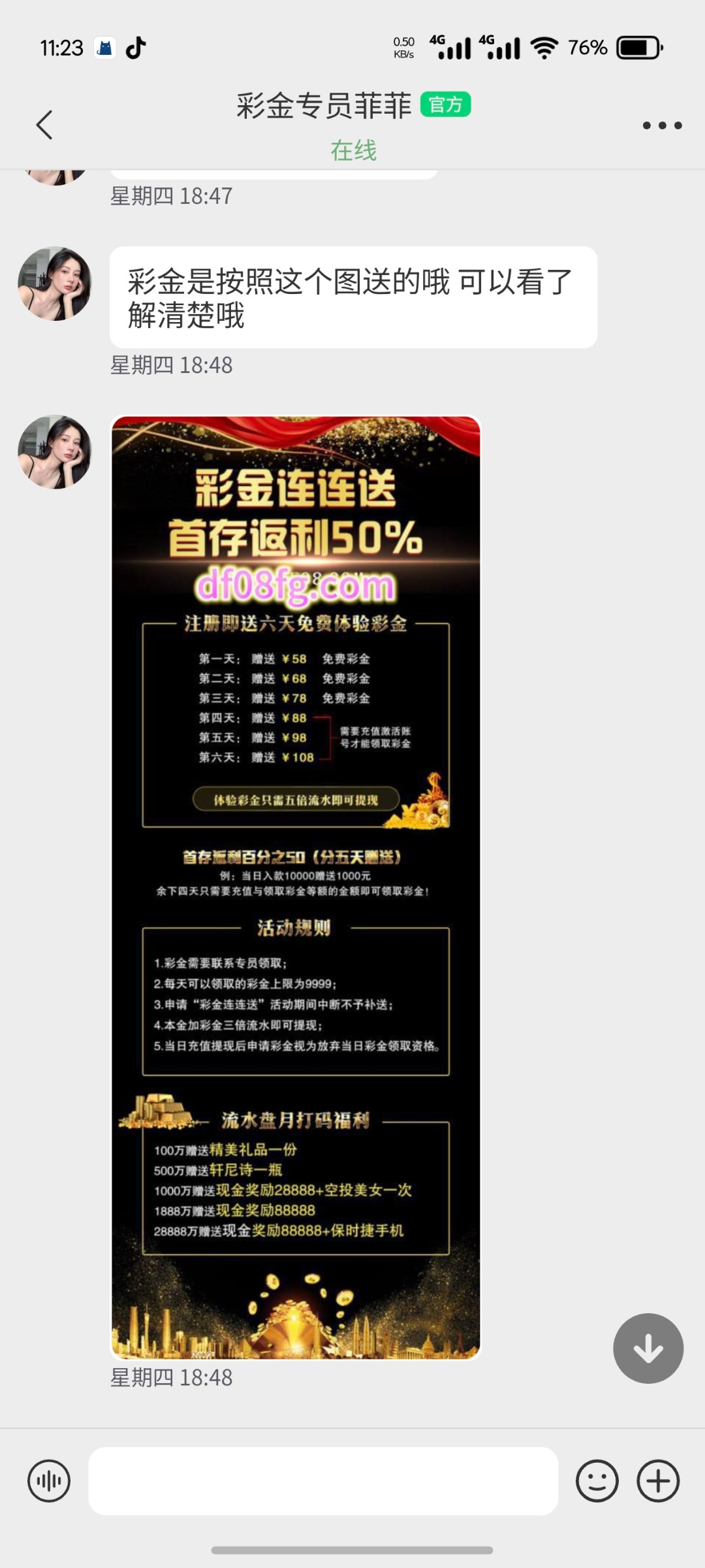 电话特邀碰瓷送498分6天,以前玩过大发送过500或者1000的可以去试试,就是以前的08大发,现在改送498,限制特别多,免费就送三天,后面三天需要充值,不建议上,根本不可能出,流水太高了,还不能梭哈,不能高于三分钟以上的彩票,简而言之就是只能快三。以前有号的可以去碰瓷,碰不到注册可能送回访,我碰瓷过几次。不要充值,谁充谁傻逼。