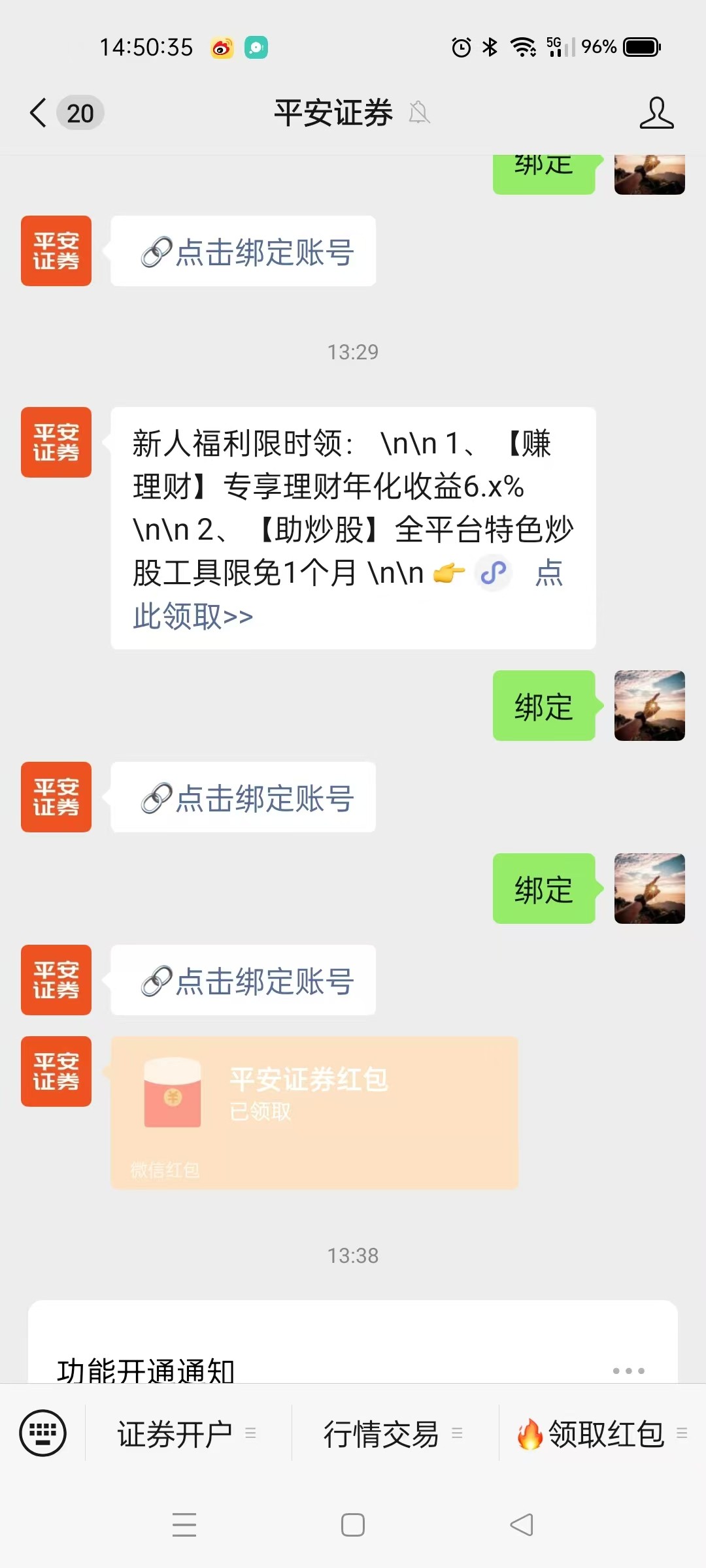 先开户,接到电话 重新扫描二维码领取 关注平安证劵公众号绑定账号 然后下载app登陆点我的 拉下去点你的新客福利已到账点进去就可以看到微信红包 点领取就到账微信了