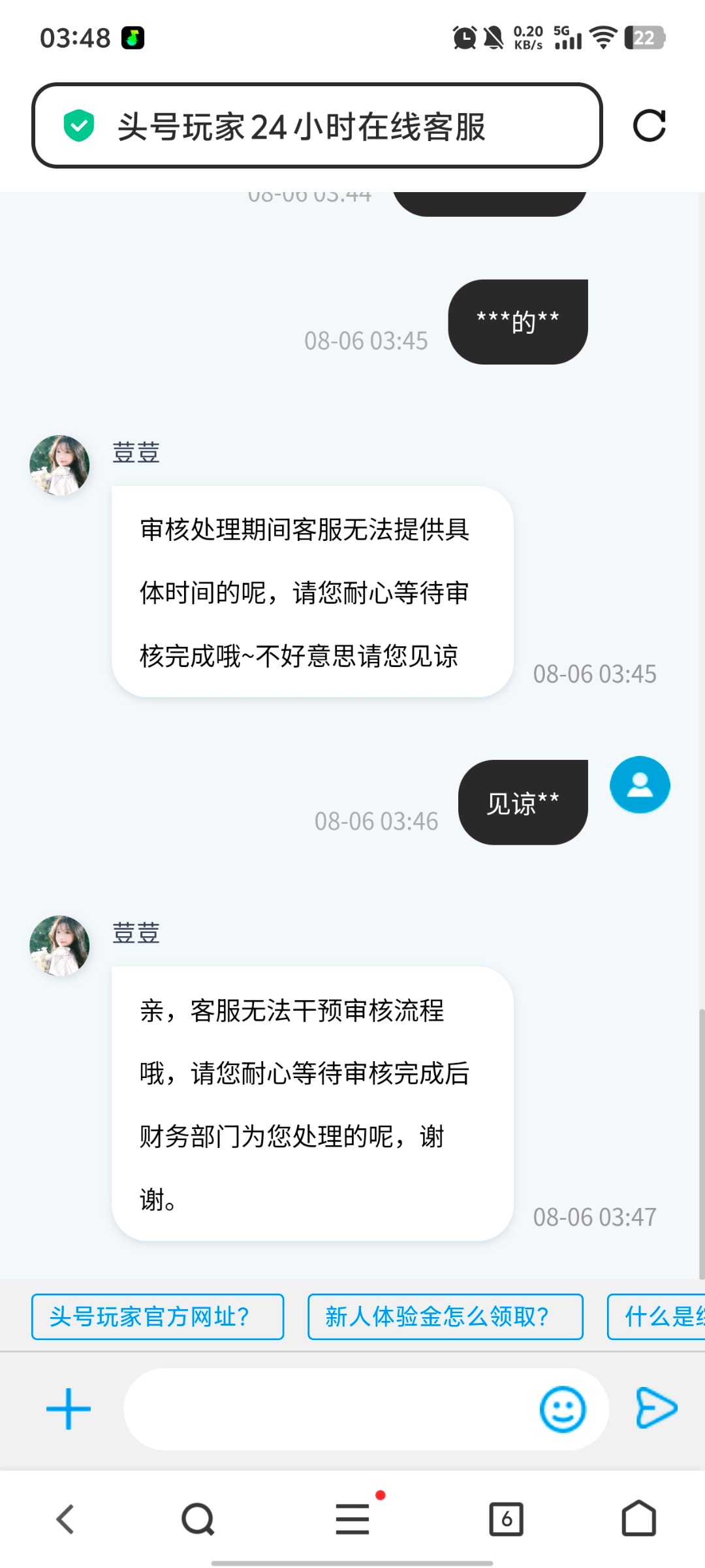 额 头号玩家审核确实慢 一般不黑款 我用28彩金打到388提了审核了3个多小时 然后有电话回访回访完秒了