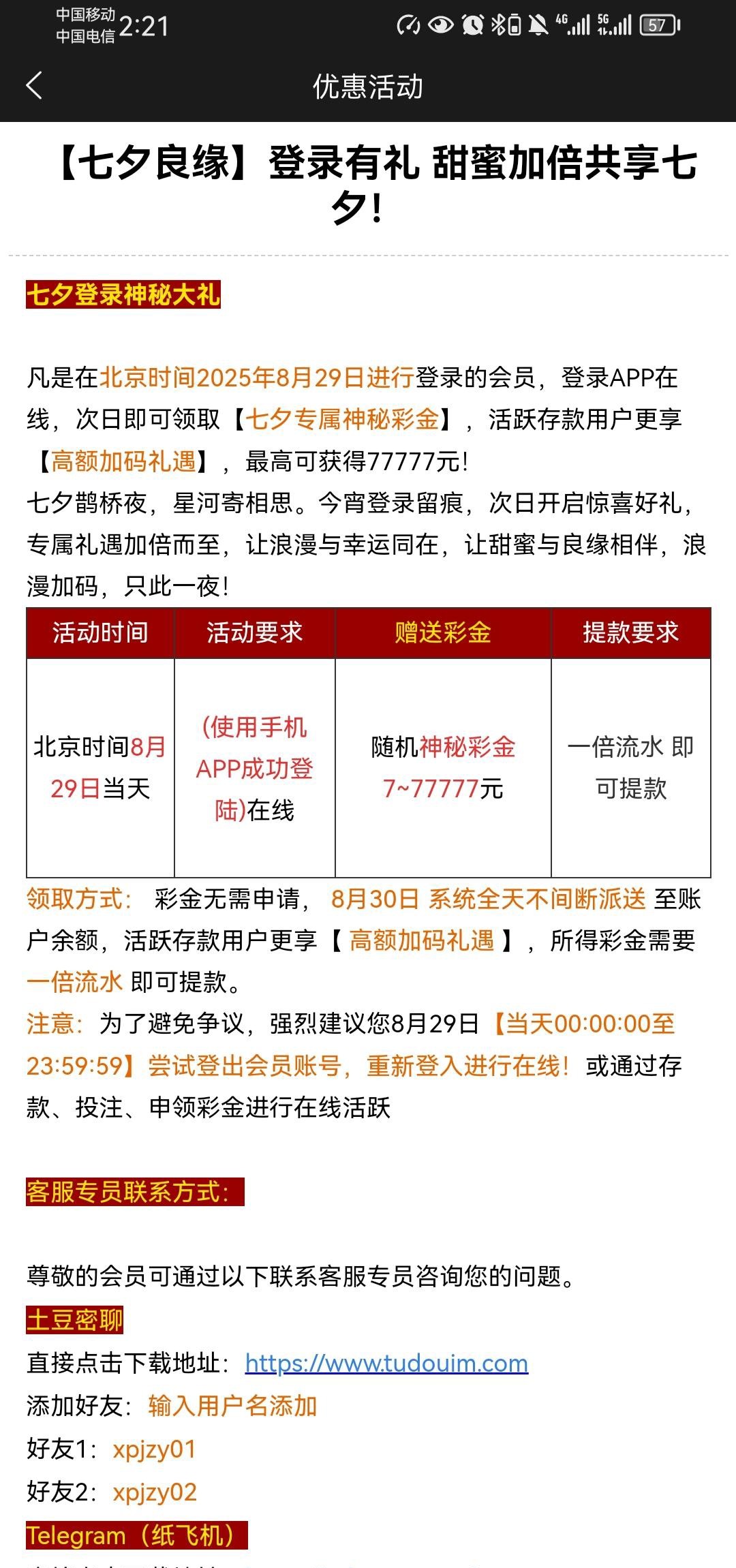 七夕回馈彩金,有号去看