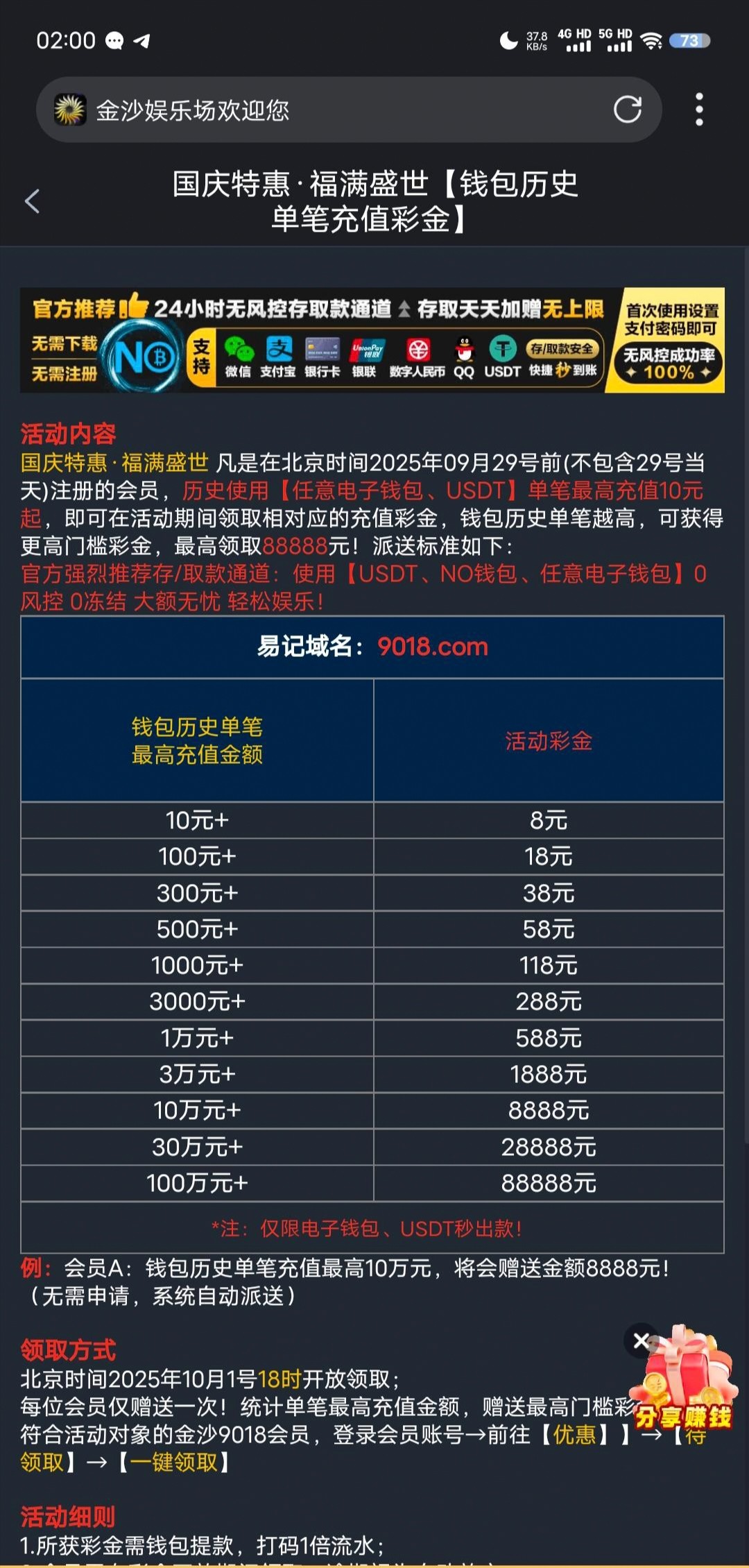 一个是历史单笔存款彩金。充过的至少能领8块