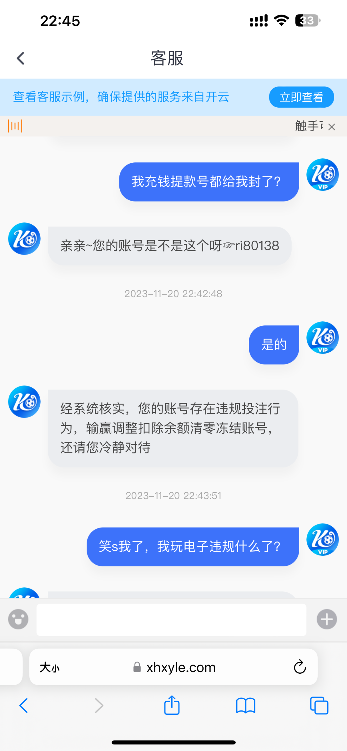 打电话来,充了100,提款400直接黑掉了,大黑比台子一点格局都没有,谁玩谁倒霉!开云千万别去玩 充值提款黑 几百块钱都要黑掉,说我违规投注 我全程都是在玩电子 大黑比
