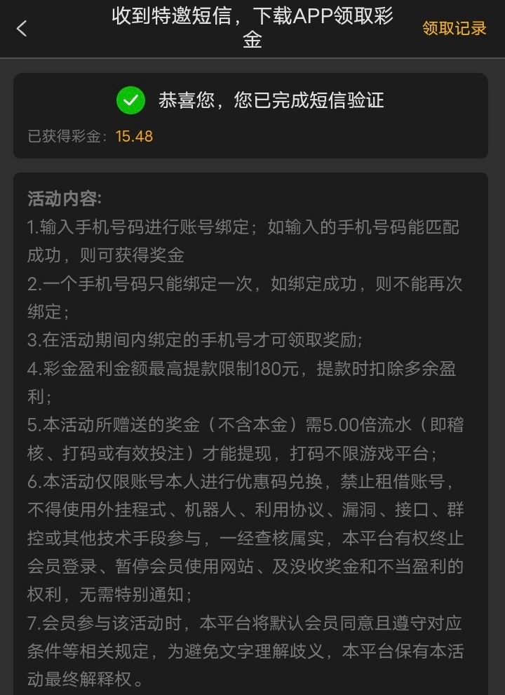 新用户自助验证短信特邀,金额是随机赠送的,手机号码碰瓷吧,具体自测吧。